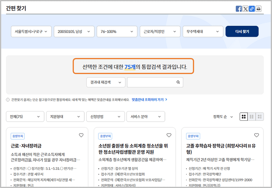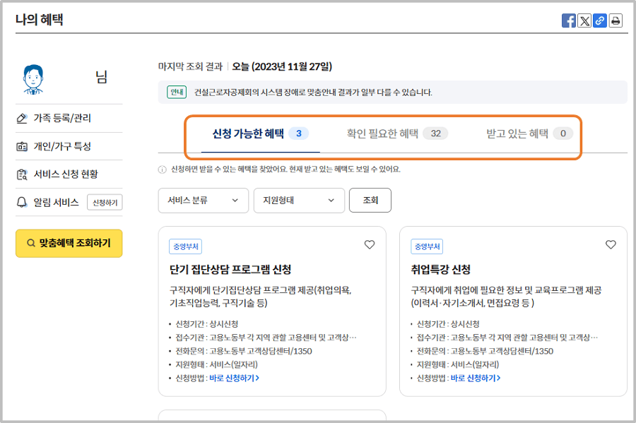 [맞춤안내 조회하기] 버튼을 누르면 결과가 표시됩니다.