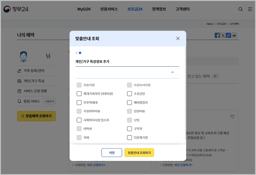 맞춤안내 조회에서 개인/가구 특성정보를 추가합니다.