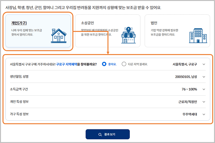 우리 가족이 받을 수 있는 보조금을 한 번에 확인하고 신청할 수 있는 맞춤형 서비스입니다.