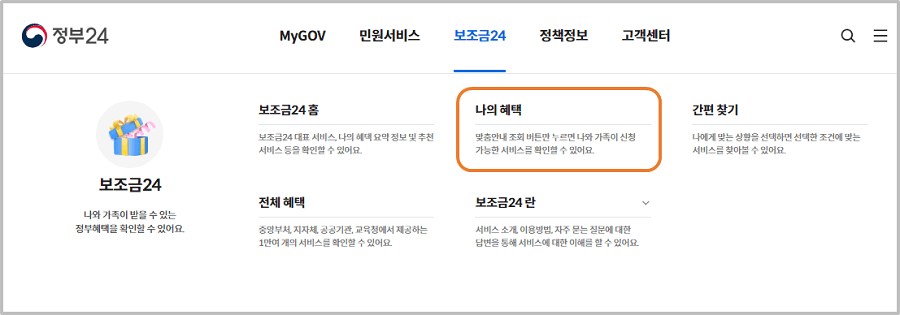 보조금24 메뉴에서 [나의 혜택]을 클릭합니다.