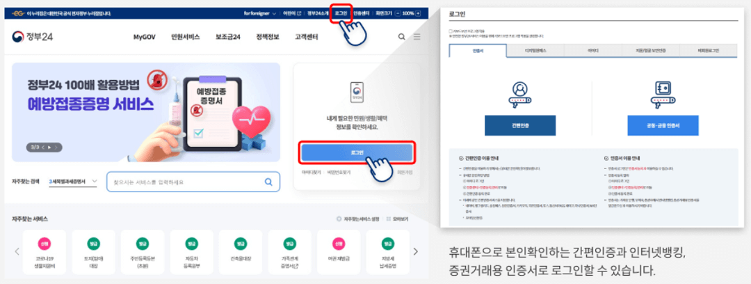 정부24 홈페이지는 보조금24 외에도 다양한 서비스를 제공하고 있으니, 미리 회원가입을 해 두는 것도 좋습니다. 회원가입이 귀찮은 경우, 네이버 등의 간편인증을 통해서도 접속할 수 있습니다.