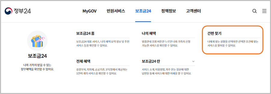 보조금24 메뉴에서 [간편 찾기]를 클릭합니다.