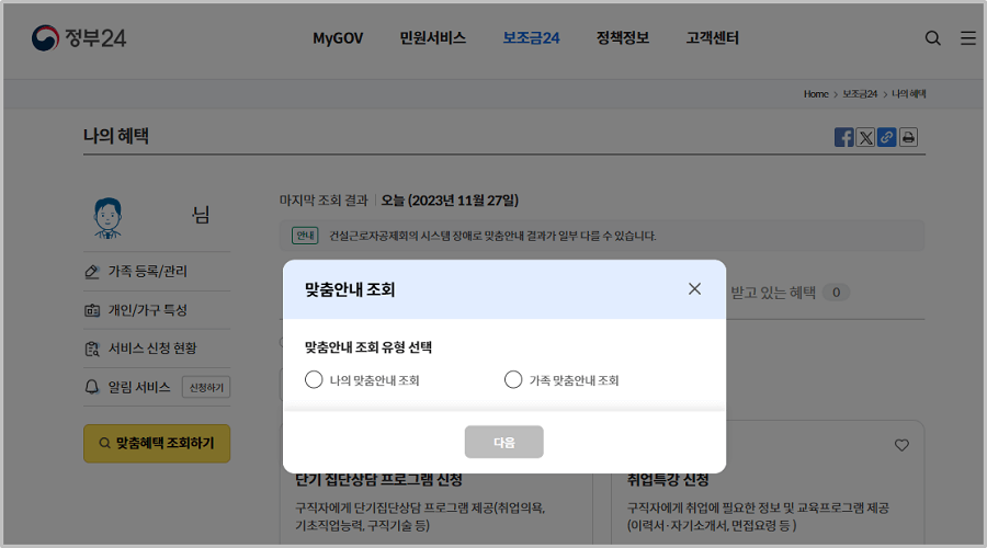 맞춤안내 조회에서 조회 유형을 선택합니다. (나 / 가족)