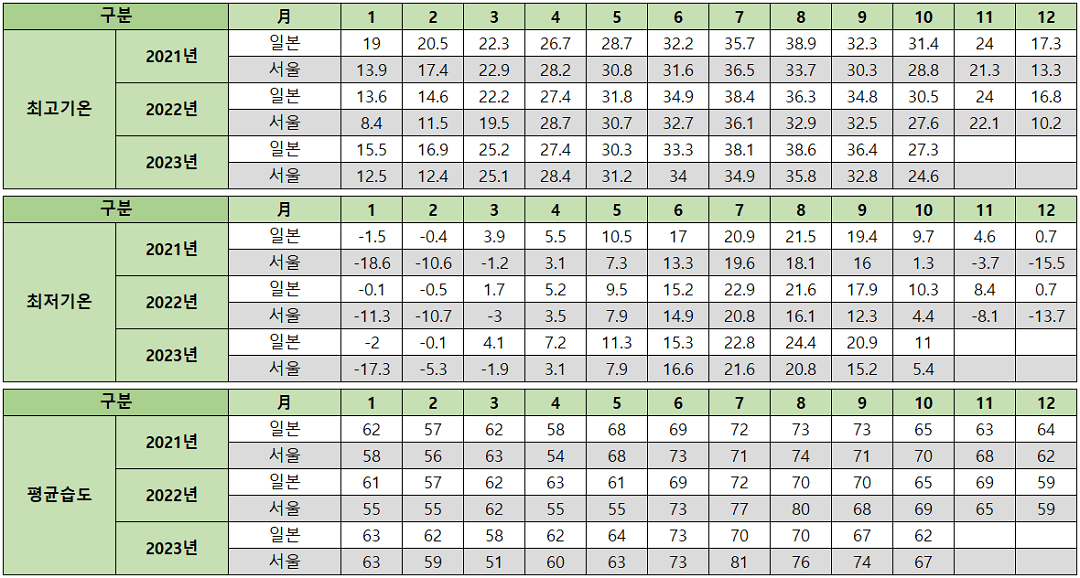위의 기온표만 보고 오사카인지, 서울인지 구분하기는 어려울 것입니다.
