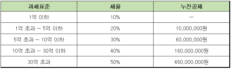 증여세 산출 시 적용되는 세율은 일반적인 소득세보다 높게 부과되는 특징이 있습니다. 아무래도 무상으로 얻는 소득이다 보니 조금 더 높은 세율이 적용되는 것으로 보입니다. 증여세 세율은 아래 그림과 같습니다.