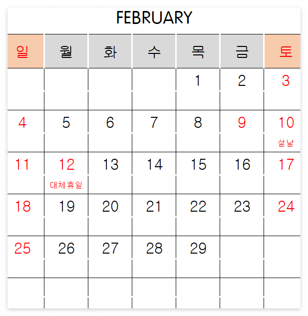 ▣ 2월 9일(금) ~ 12일(월) 설날: 총 4일을 쉴 수 있습니다. 12일은 대체휴일로 지정되었습니다.