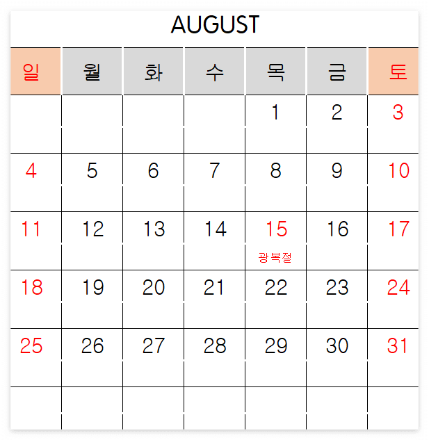 ▣ 8월 15일(목): 광복절. 8월 16일(금)에 연차를 사용 시, 4일 동안 쉴 수 있습니다.