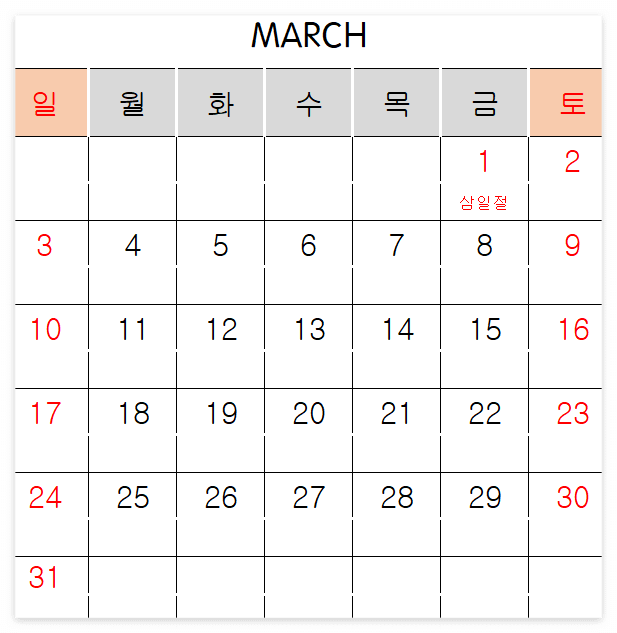 ▣ 3월 1일 삼일절(금): 3월 3일(일)까지 3일 동안 쉴 수 있습니다.