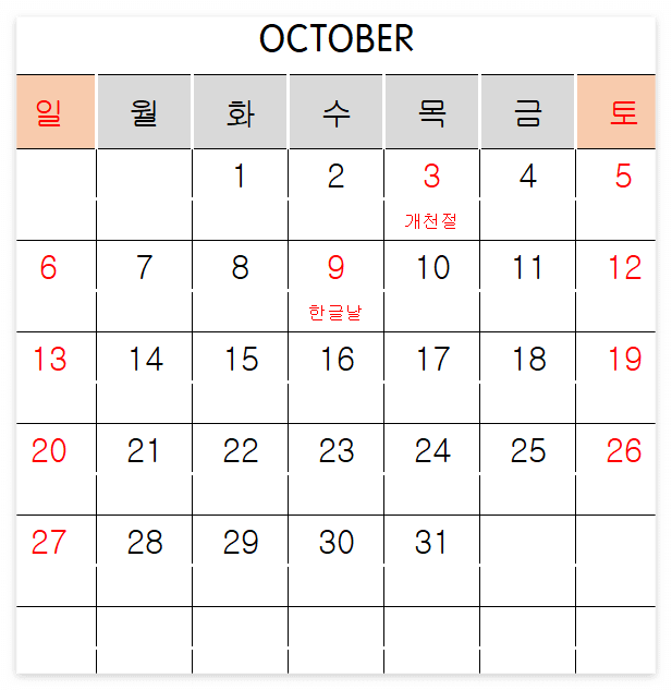▣ 10월 3일(목): 개천절. 10월 4일(금)에 연차를 사용 시, 4일 동안 쉴 수 있습니다.